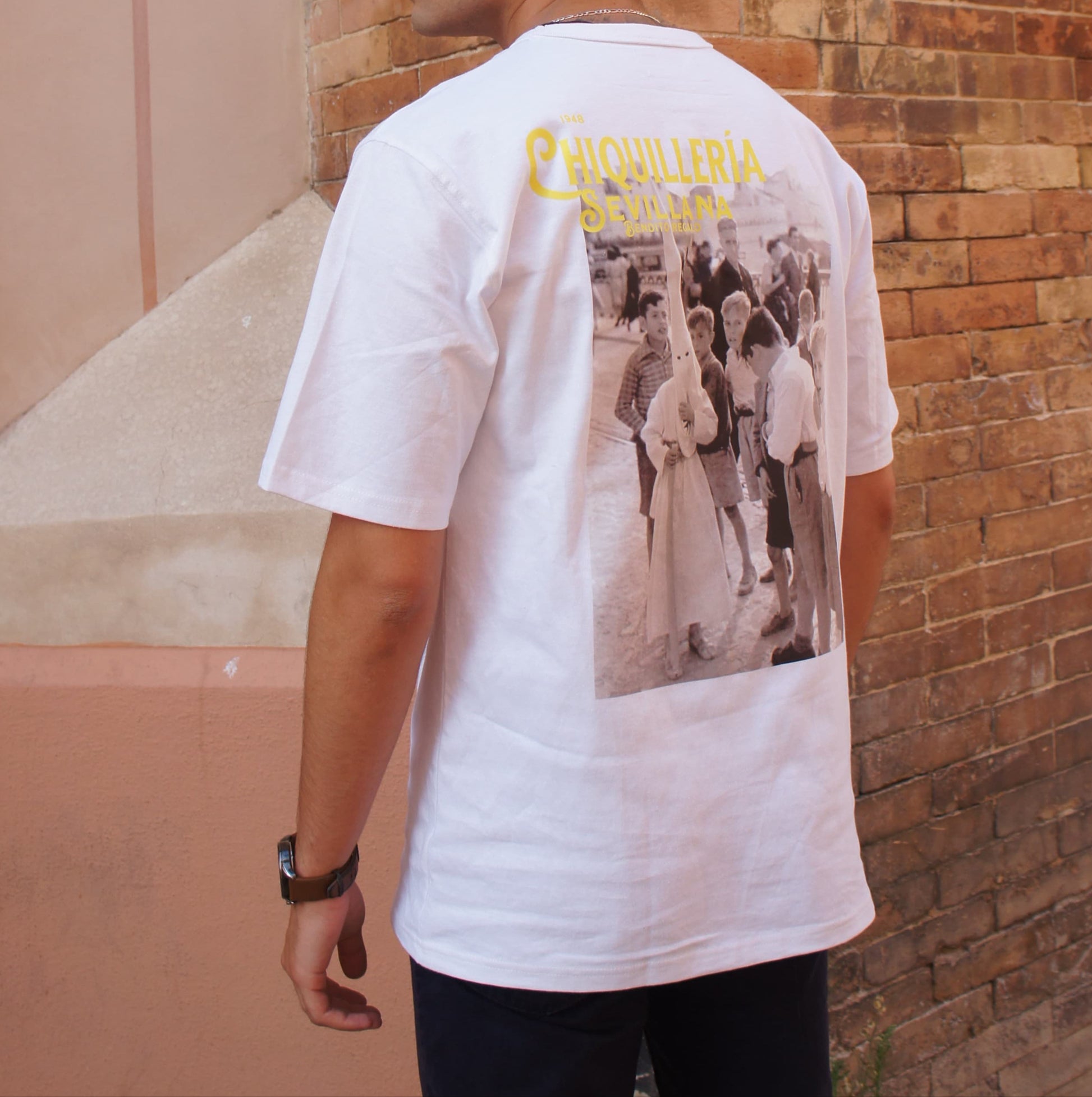 Diseño inspirado en la Semana Santa sevillana de 1948, con un homenaje a la tradición iconográfica nazarena. Bajo el título 'Chiquillería Sevillana - Bendito Regalo', esta camiseta captura un momento histórico con la fascinación de los niños ante las procesiones, disponible en dos variantes de color.